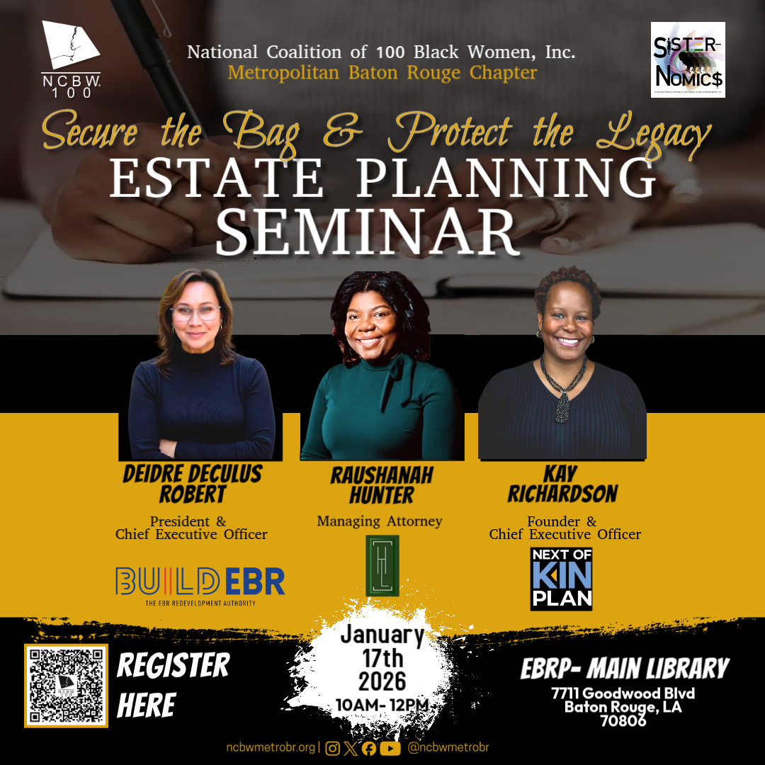The Sisternomic$ 4-part series entitled: Building Generational Wealth Through Entrepreneurship workshops included: Business Success for Start – Up and Scaling, Funding Opportunities from SBA, LED & BRAC and Introducing the TRUFUND, DEB Certification and HUDSON Initiative; and the Louisiana Small Business Development Center at Southern University. We also held a session on Legal/Valuation/ and Estate Planning.