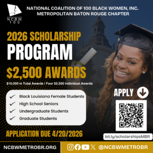 This website is the sole property and responsibility of the National Coalition of 100 Black Women, Inc. - Metropolitan Baton Rouge Chapter © 2025. All Rights Reserved. Designed by SRJWebsites.com.
